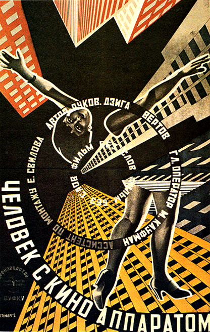 O primeiro é o cartaz criado por Georgii e Vladimir Stenberg, para o filme Um homem com uma câmera, 1929. O dinamismo, movimento e a perspectiva que observamos no cartaz é fruto do uso de fragmentos de imagens, que foram reunidas por meio da técnica de fotomontagem, criando uma nova identidade.